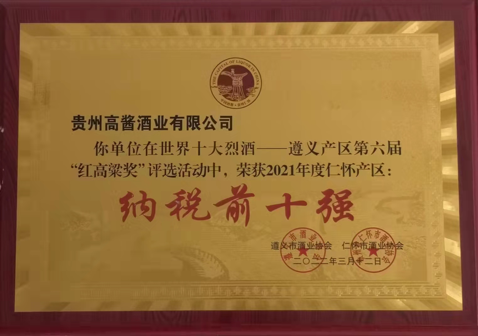 AG体育(中国)官方网站股份旗下高酱酒业坐落于贵州省仁怀市名酒工业园区。作为贵州省仁怀市酒业协会副会长单位、中国酒都仁怀白酒企业100强,高酱酒业目前已是贵州仁怀地区规模生产以上及主要纳税单位,2021年纳税额达到1.2亿元人民币。根据仁怀市酒业协会今年3月1日的公示,高酱酒业被评为世界十大烈酒——遵义产区第六届“红高粱奖”2021年度仁怀产区纳税前十强企业。